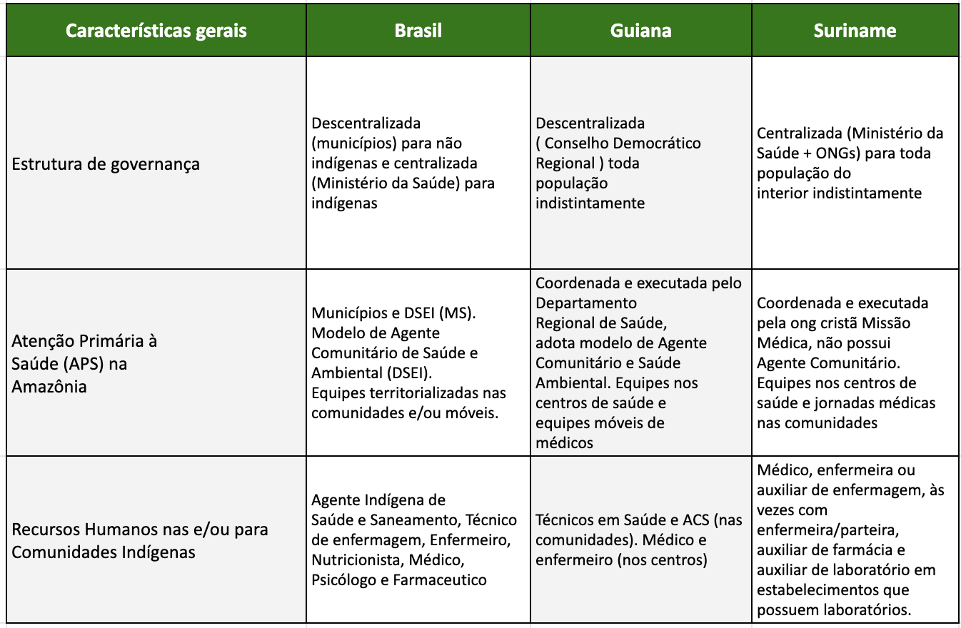 Em relação aos outros países fronteiriços, enquanto o Brasil possui um serviço de saúde específico para população indígena, na Guiana, por exemplo, os sistemas de atenção são todos municipalizados, dando conta de toda população local e seguindo a lógica da participação social por meio de comitês e conselhos populares integrados por representantes indígenas. Na prática, os profissionais de saúde da atenção básica são compostos por técnicos de nível médio, os Medex, enquanto no Brasil, a equipe de saúde indígena é integrada por profissionais multidisciplinares de nível superior.