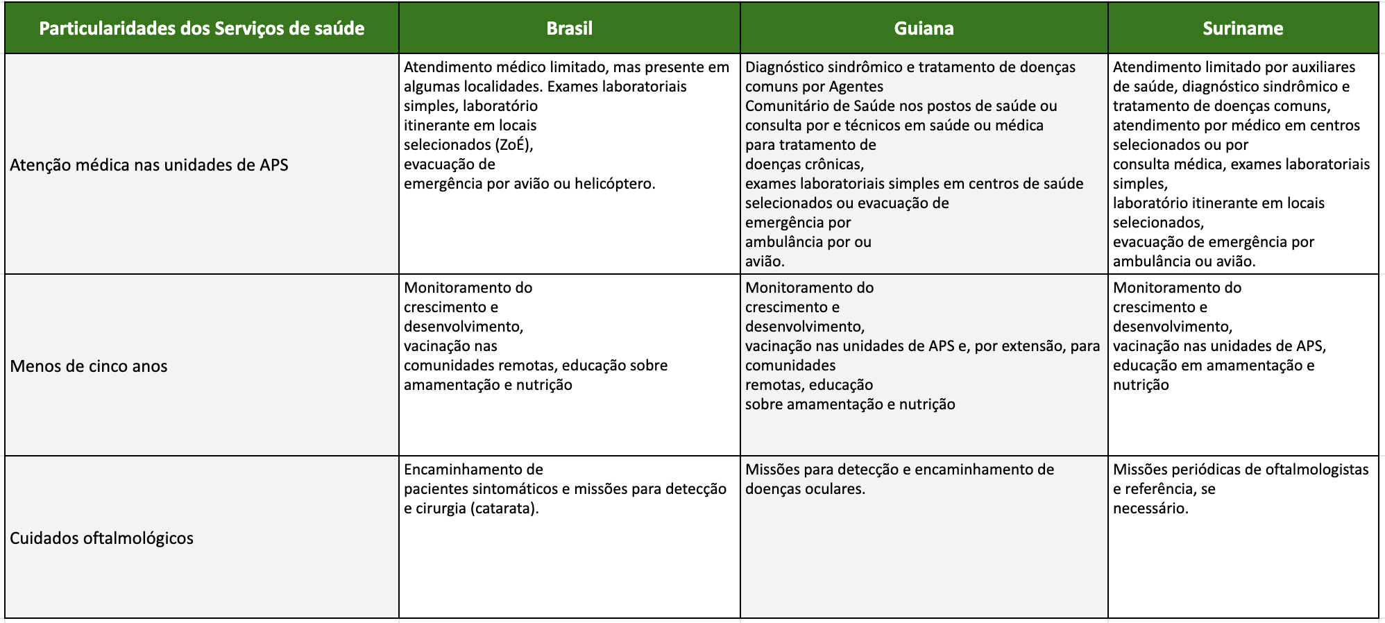 Já no Suriname, com sistema de governo centralizado, a atenção básica é delegada a uma ONG, a Medical Mission, que possui certa autonomia no planejamento e execução das ações, ficando o Ministério da Saúde responsável pela vigilância epidemiológica, como é o caso do Programa de Malária. Uma característica comum nos três países é a baixa oferta de médicos nos serviços de atenção primária, diante disso, a Medical Mission costuma promover jornadas médicas - concentração de serviços médicos no local por um tempo curto - nos territórios indígenas da Amazônia.